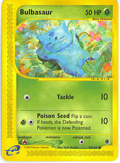 | Type | Grass | | Pokemon serie | Expedition | | Stadie | Basic | | HP | 50 | | Sjældenhed | Common | | Tilbagetrækning | 1 | | Svaghed | R | | Kortnummer | 94 | | Evne |