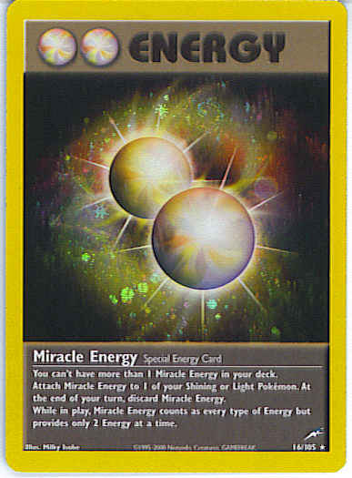 This card can only be attached to a Shining Pokemon or Gentle Pokemon, and is discarded at the end of the turn. This card provides 2 Energy of any types that you choose when needed. If this card is attached to a Pokemon that isn't a Shining Pokemon or a Gentle Pokemon, this card is discarded. NOTE: You may only include 1 Miracle Energy card in your deck.