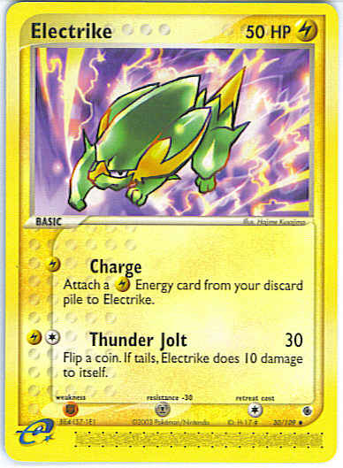 | Type | Lightning | | Pokemon serie | Ruby Sapphire | | Stadie | Basic | | HP | 50 | | Sjældenhed | Uncommon | | Tilbagetrækning | 1 | | Modstand | M | | Svaghed | F | | Kortnummer | 30 | | Evne | [L] Charge - Attach a L Energy card from your discard pile to Electrike. [CL] Thunder Jolt (30) Flip a coin. If tails, Electrike does 10 damage to itself.