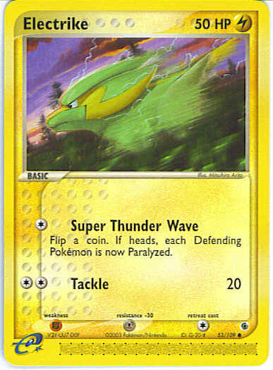 | Type | Lightning | | Pokemon serie | Ruby Sapphire | | Stadie | Basic | | HP | 50 | | Sjældenhed | Common | | Tilbagetrækning | 1 | | Modstand | M | | Svaghed | F | | Kortnummer | 53 | | Evne | [C] Super Thunder Wave - Flip a coin. If heads, the Defending Pokemon is now Paralyzed. [CC] Tackle (20)