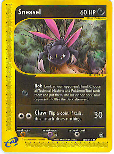 | Type | Darkness | | Pokemon serie | Aquapolis | | Stadie | Basic | | HP | 60 | | Sjældenhed | Common | | Tilbagetrækning | 1 | | Modstand | P | | Svaghed | F | | Kortnummer | 110 | | Evne | [D] Rob - Look at your opponent's hand. If he or she has any Technical Machines or Pokemon Tools, shuffle all of those cards into your opponent's deck. [CC] Claw (30) Flip a coin. If tails, this attack does nothing.
