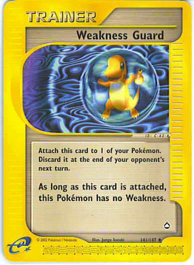 Evne2 Attach Weakness Guard to 1 of your Pokemon. At the end of your opponent's next turn, discard Weakness Guard. The Pokemon Weakness Guard is attached to has no Weakness.