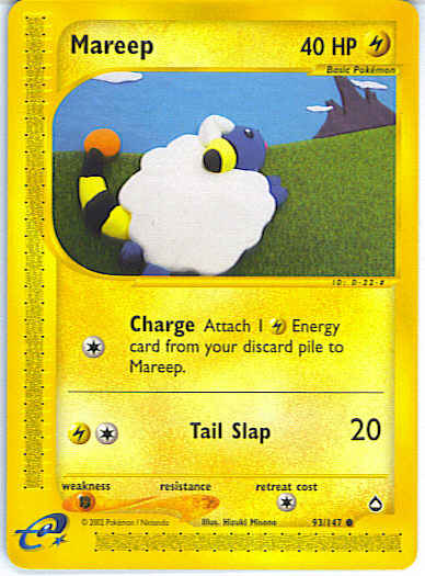 | Type | Lightning | | Pokemon serie | Aquapolis | | Stadie | Basic | | HP | 40 | | Sjældenhed | Common | | Tilbagetrækning | 1 | | Svaghed | F | | Kortnummer | 93 | | Evne | [C] Charge - Attach 1 L Energy card in your discard pile, if any, to Mareep. [CL] Tail Slap (20)