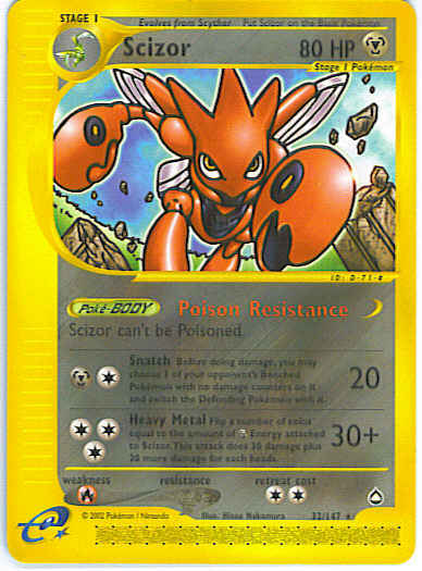 [CCC] Heavy Metal (30+) Flip a number of coins equal to the number of Metal Energy attached to Scizor. This attack does 30 damage plus 20 damage times the number of heads.
