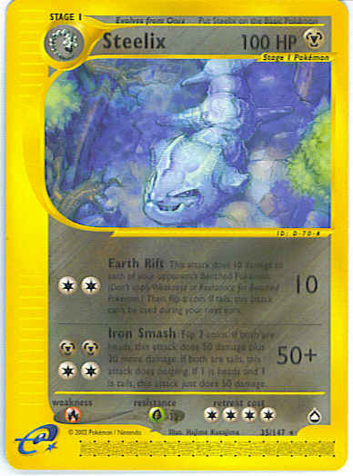| Type | Metal | | Pokemon serie | Aquapolis | | Stadie | Stage 1 | | HP | 100 | | Sjældenhed | Rare | | Tilbagetrækning | 4 | | Modstand | G | | Svaghed | R | | Kortnummer | 35 | | Evne | [CC] Earth Rift (10) Does 10 damage to each of your opponent's Benched Pokemon. (Don't apply Weakness and Resistance for Benched Pokemon.) Flip a coin. If tails, you can't use this attack during your next turn. [CCMM] Iron Smash (50+) Flip 2 coins. If 1 is heads, this attack does 50 damage. If both are heads, this attack does 50 damage plus 20 more damage. If both are tails, this attack does nothing.