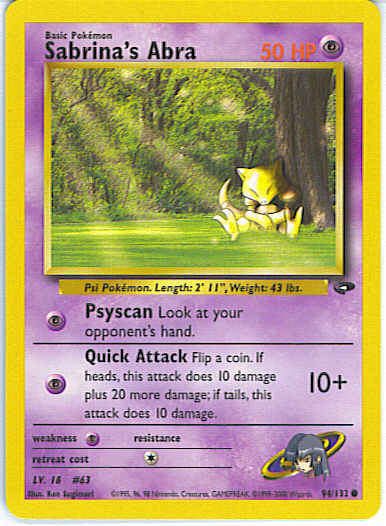 | Type | Psychic | | Pokemon serie | Gym Challenge | | Stadie | Basic | | HP | 50 | | Sjældenhed | Common | | Tilbagetrækning | 1 | | Svaghed | P | | Kortnummer | 94 | | Evne |
