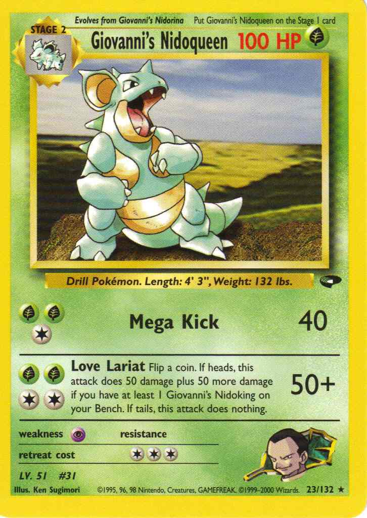 [CCGG] Love Lariat (50+) Flip a coin. If heads, this attack does 50 damage plus 50 more damage if you have at least 1 Giovanni's Nidoking on your Bench. If tails, this attack does nothing.