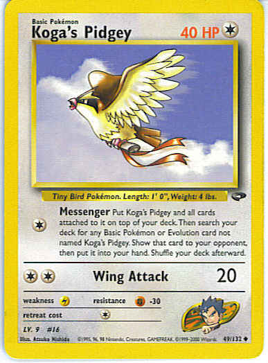 Evne [C] Messenger - Put Koga's Pidgey and all cards attached to it on top of your deck. Then search your deck for any Basic Pokemon or Evolution card not named Koga's Pidgey. Show that card to your opponent, then put it into your hand. Shuffle your deck afterward.