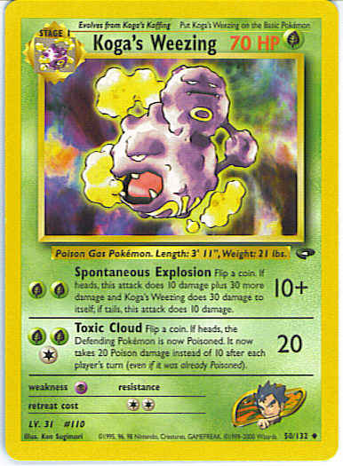 Evne [GG] Spontaneous Explosion (10+) Flip a coin. If heads, this attack does 10 damage plus 30 more damage and Koga's Weezing does 30 damage to itself; if tails, this attack does 10 damage.