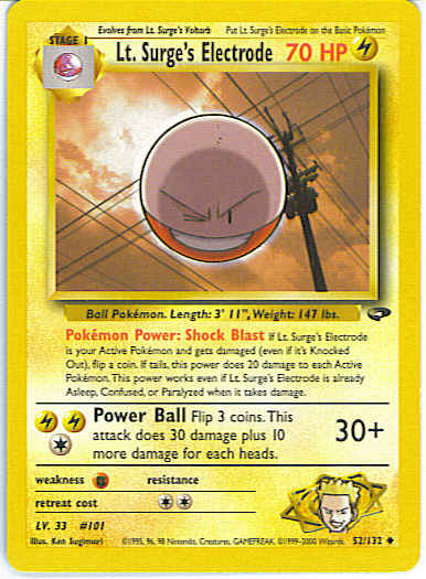 | Type | Lightning | | Pokemon serie | Gym Challenge | | Stadie | Stage 1 | | HP | 70 | | Sjældenhed | Uncommon | | Tilbagetrækning | 2 | | Svaghed | F | | Kortnummer | 52 | | Evne |