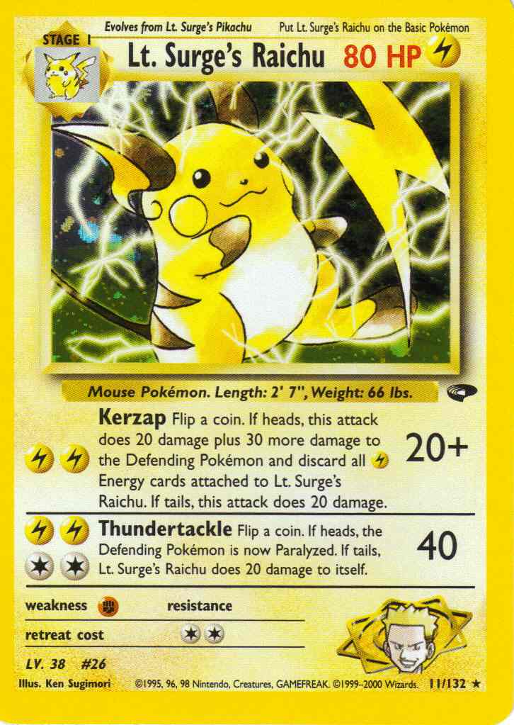 Evne [LL] Kerzap (20+) Flip a coin. If heads, this attack does 20 damage plus 30 more damage to the Defending Pokemon and discard all L Energy cards attached to Lt. Surge's Raichu. If tails, this attack does 20 damage.