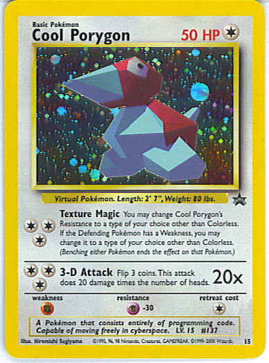 Evne [CCC] Texture Magic - You may change Cool Porygon's Resistance to a type of your choice other than Colorless. If the Defending Pokemon has a Weakness, you may change it to a type of your choice other than Colorless. (Benching either Pokemon ends the effect on that Pokemon.)