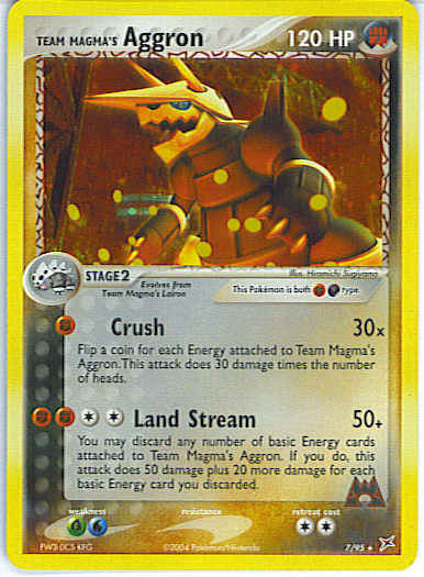 | | Evne2 | [F] Crush (30x) Flip a coin for each Energy attached to Team Magma's Aggron. This attack does 30 damage times the number of heads. [CCFF] Land Stream (50+) You may discard any number of basic Energy cards attached to Team Magma's Aggron. If you do, this attack does 50 damage plus 20 more damage for each basic Energy card you discarded.