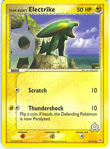 | Type | Lightning | | Pokemon serie | Team Aqua-Team Magma | | Stadie | Basic | | HP | 50 | | Sjældenhed | Common | | Tilbagetrækning | 1 | | Modstand | M | | Svaghed | F | | Kortnummer | 52 | | Evne | [C] Scratch (10) [CL] Thundershock (10) Flip a coin. If heads, the Defending Pokemon is now Paralyzed.