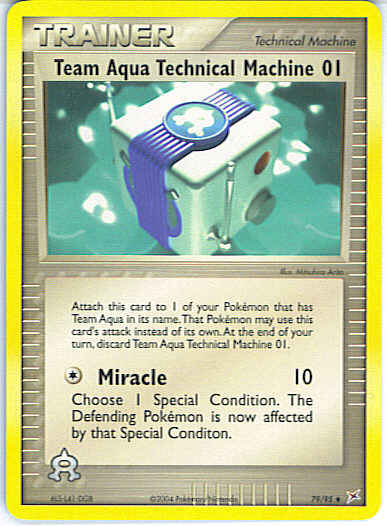 | Type | Trainer | | Pokemon serie | Team Aqua-Team Magma | | Stadie | Trainer (Technical Machine) | | Sjældenhed | Uncommon | | Kortnummer | 79 | | Evne | [C] Miracle (10) Choose 1 Special Condition. The Defending Pokemon is now affected by that Special Condition.