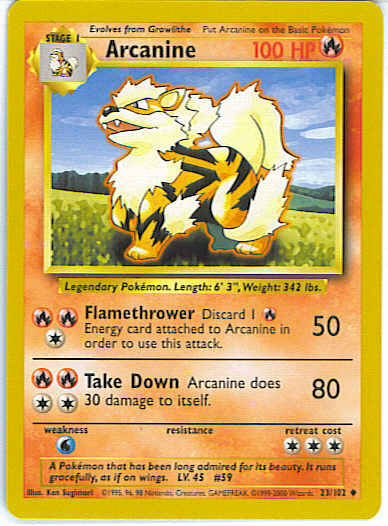 | Type | Fire | | Pokemon serie | Base | | Stadie | Stage 1 | | HP | 100 | | Sjældenhed | Uncommon | | Tilbagetrækning | 3 | | Svaghed | W | | Kortnummer | 23 | | Evne |
