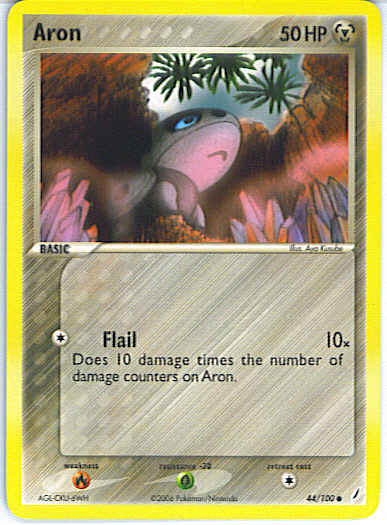 | Type | Metal | | Pokemon serie | Crystal Guardians | | Stadie | Basic | | HP | 50 | | Sjældenhed | Common | | Tilbagetrækning | 1 | | Modstand | G | | Svaghed | R | | Kortnummer | 44 | | Evne | [C] Flail (10x) Does 10 damage times the number of damage counters on Aron. | | Evne2 | [C] Flail (10x) Does 10 damage times the number of damage counters on Aron. | | Kunstner | Aya Kusube |