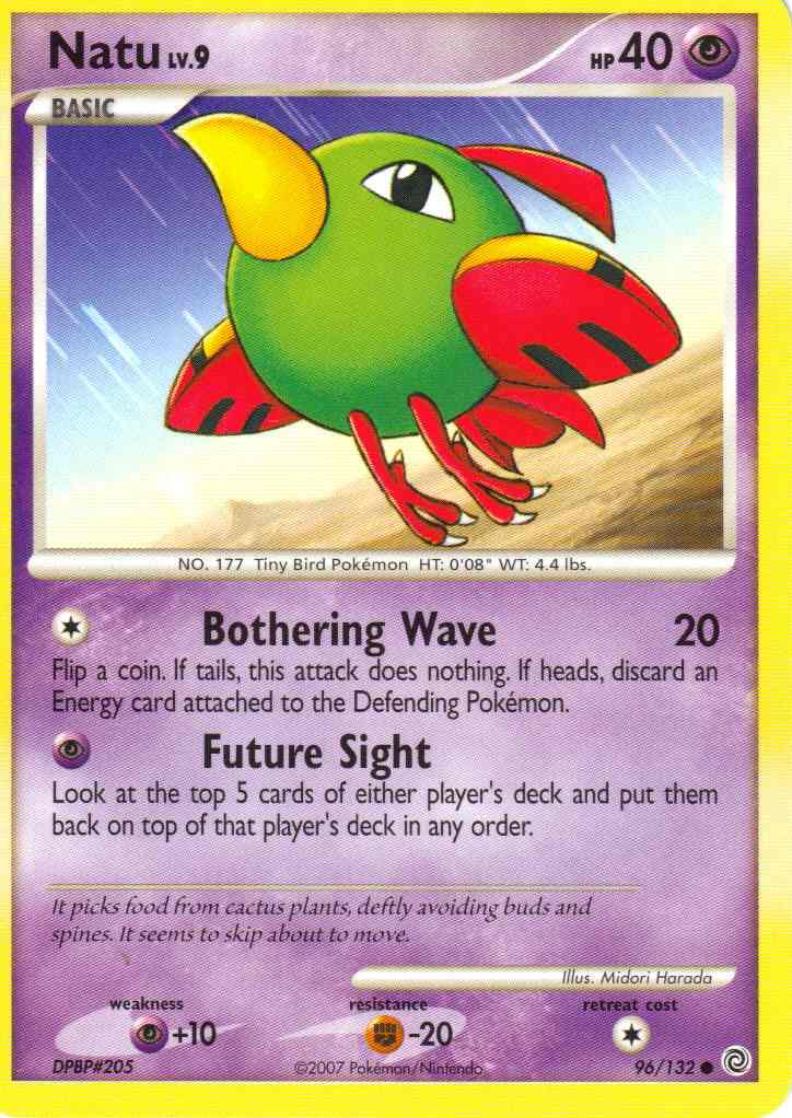 | Type | Psychic | | Pokemon serie | Secret Wonders | | Stadie | Basic | | HP | 40.0 | | Sjældenhed | Common | | Tilbagetrækning | 1.0 | | Modstand | F-20 | | Svaghed | P+10 | | Kortnummer | 96 | | Evne |