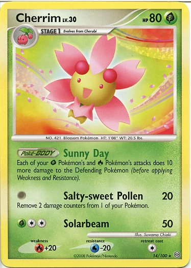 | Type | Grass | | Pokemon serie | Stormfront | | Stadie | Stage 1 | | HP | 80.0 | | Sjældenhed | Rare | | Tilbagetrækning | 1.0 | | Modstand | W-20 | | Svaghed | R+20 | | Kortnummer | 14 | | Evne |