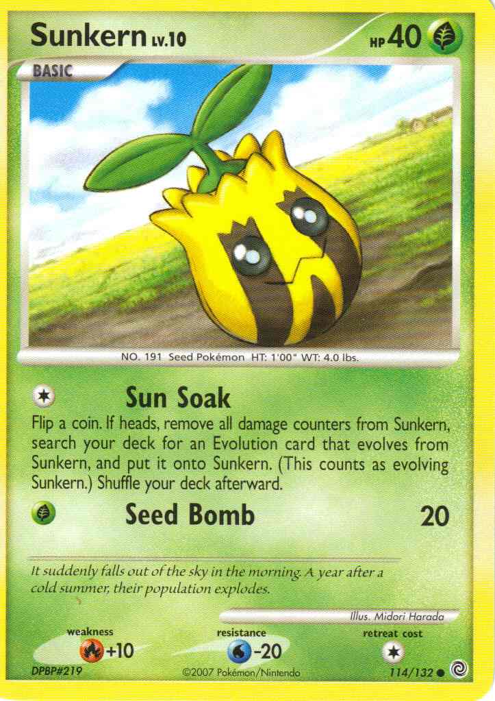 Evne [C] Sun Soak - Flip a coin. If heads, remove all damage counters from Sunkern, search your deck for an Evolution card that evolves from Sunkern, and put it onto Sunkern. (This counts as evolving Sunkern.) Shuffle your deck afterward.