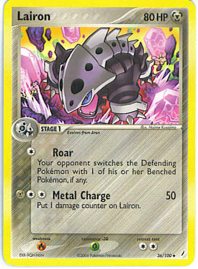 | Type | Metal | | Pokemon serie | Crystal Guardians | | Stadie | Stage 1 | | HP | 80 | | Sjældenhed | Uncommon | | Tilbagetrækning | 2 | | Modstand | G | | Svaghed | R | | Kortnummer | 36 | | Evne | [C] Roar - Your opponent switches the Defending Pokemon with 1 of his or her Benched Pokemon, if any. [CCM] Metal Charge (50) Put 1 damage counter on Lairon. | | Evne2 | [C] Roar - Your opponent switches the Defending Pokemon with 1 of his or her Benched Pokemon, if any. [CCM] Metal Charge (50) Put 1 damage counter on Lairon. | | Kunstner | Hajime Kusajima |