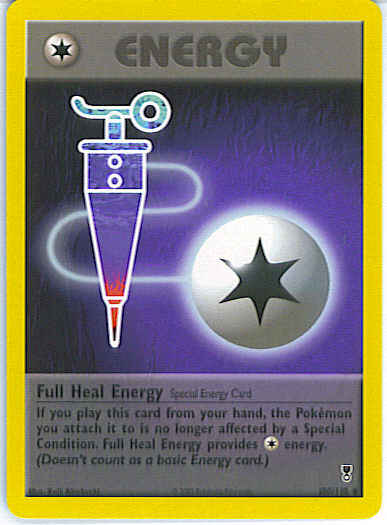 Evne If you play this card from your hand, the Pokemon you attach it to is no longer Asleep, Confused, Paralyzed, or Poisoned. Full Heal Energy Provides 1 Colorless energy. (Doesn't count as a basic Energy card.)