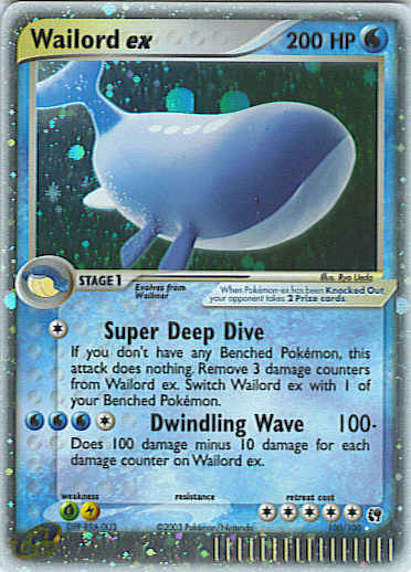 | | Evne2 | [C] Super Deep Dive - If you have no Benched Pokemon, this attack does nothing. Remove 3 damage counters from Wailord ex. Switch Wailord ex with 1 of your Benched Pokemon. [CWWW] Dwindling Wave (100-) Does 100 damage minus 10 damage for each damage counter on Wailord ex.