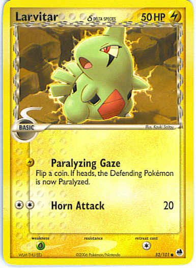 | Type | Lightning | | Pokemon serie | Dragon Frontiers | | Stadie | Basic | | HP | 50 | | Sjældenhed | Common | | Tilbagetrækning | 1 | | Svaghed | W | | Kortnummer | 52 | | Evne | [L] Paralyzing Gaze - Flip a coin. If heads, the Defending Pokemon is now Paralyzed. [CC] Horn Attack (20)