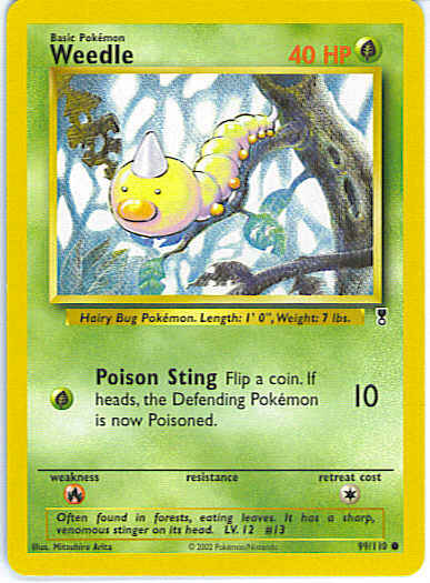 | Type | Grass | | Pokemon serie | Legendary Collection | | Stadie | Basic | | HP | 40 | | Sjældenhed | Common | | Tilbagetrækning | 1 | | Svaghed | R | | Kortnummer | 99 | | Evne |