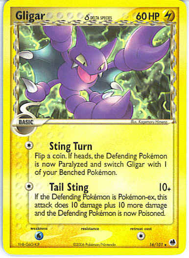 Evne2[C] Sting Turn - Flip a coin. If heads, the Defending Pokemon is now Paralyzed and switch Gligar with 1 of your Benched Pokemon.