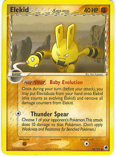 | Type | Fighting | | Pokemon serie | Dragon Frontiers | | Stadie | Basic | | HP | 40 | | Sjældenhed | Common | | Tilbagetrækning | 1 | | Svaghed | F | | Kortnummer | 48 | | Evne | [C] Thunder Spear - Choose 1 of your opponent's Pokemon. This attack does 10 damage to that Pokemon. (Don't apply Weakness and Resistance for Benched Pokemon.)
