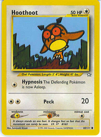 | Type | Colorless | | Pokemon serie | Neo Genesis | | Stadie | Basic | | HP | 50 | | Sjældenhed | Common | | Tilbagetrækning | 1 | | Modstand | F | | Svaghed | L | | Kortnummer | 60 | | Evne |