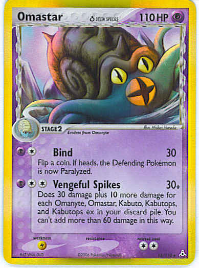 [CCP] Vengeful Spikes (30+) Does 30 damage plus 10 more damage for each Omanyte, Omastar, Kabuto, Kabutops, and Kabutops ex in your discard pile. You can't add more than 60 damage in this way.