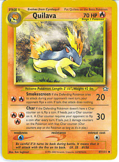 | Type | Fire | | Pokemon serie | Neo Genesis | | Stadie | Stage 1 | | HP | 70 | | Sjældenhed | Uncommon | | Tilbagetrækning | 1 | | Svaghed | W | | Kortnummer | 47 | | Evne |