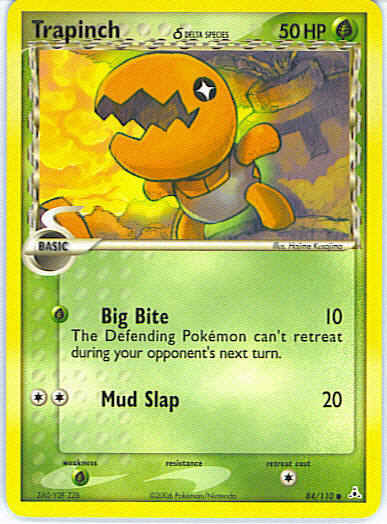 | Type | Grass | | Pokemon serie | Holon Phantoms | | Stadie | Basic | | HP | 50 | | Sjældenhed | Common | | Svaghed | G | | Kortnummer | 84 | | Evne | [G] Big Bite (10) The Defending Pokemon can't retreat during your opponent's next turn. [CC] Mud Slap (20) | | Evne2 | [G] Big Bite (10) The Defending Pokemon can't retreat during your opponent's next turn. [CC] Mud Slap (20) | | Kunstner | Katsura Tabata |