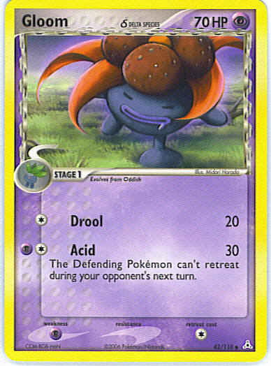 | Type | Psychic | | Pokemon serie | Holon Phantoms | | Stadie | Stage 1 | | HP | 70 | | Sjældenhed | Uncommon | | Tilbagetrækning | 2 | | Svaghed | P | | Kortnummer | 42 | | Evne | [C] Drool (20) [CP] Acid (30) The Defending Pokemon can't retreat during your opponent's next turn. | | Evne2 | [C] Drool (20) [CP] Acid (30) The Defending Pokemon can't retreat during your opponent's next turn. | | Kunstner | Mitsuhiro Arita |