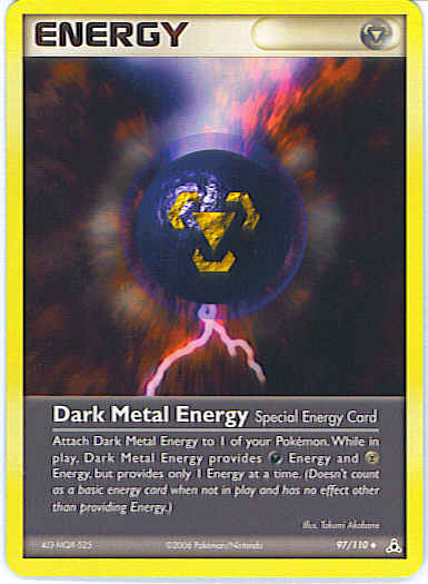 Evne Attach Dark Metal Energy to 1 of your Pokemon. While in play, Dark Metal Energy provides D Energy and M Energy, but provides only 1 Energy at a time. (Doesn't count as a basic Energy card when not in play and has no effect other than providing Energy.)