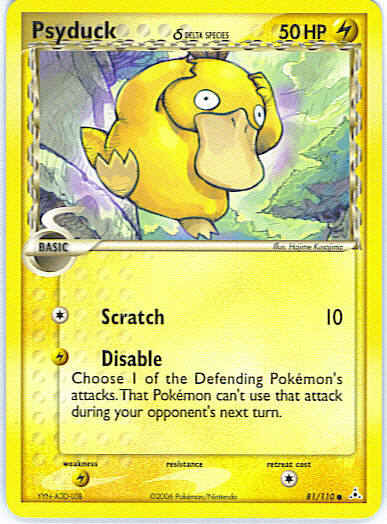 | Type | Lightning | | Pokemon serie | Holon Phantoms | | Stadie | Basic | | HP | 50 | | Sjældenhed | Common | | Tilbagetrækning | 1 | | Svaghed | L | | Kortnummer | 81 | | Evne | [C] Scratch (10) [L] Disable - Choose 1 of the Defending Pokemon's attacks. That Pokemon can't use that attack during your opponent's next turn. | | Evne2 | [C] Scratch (10) [L] Disable - Choose 1 of the Defending Pokemon's attacks. That Pokemon can't use that attack during your opponent's next turn. | | Kunstner | Kouki Saitou |